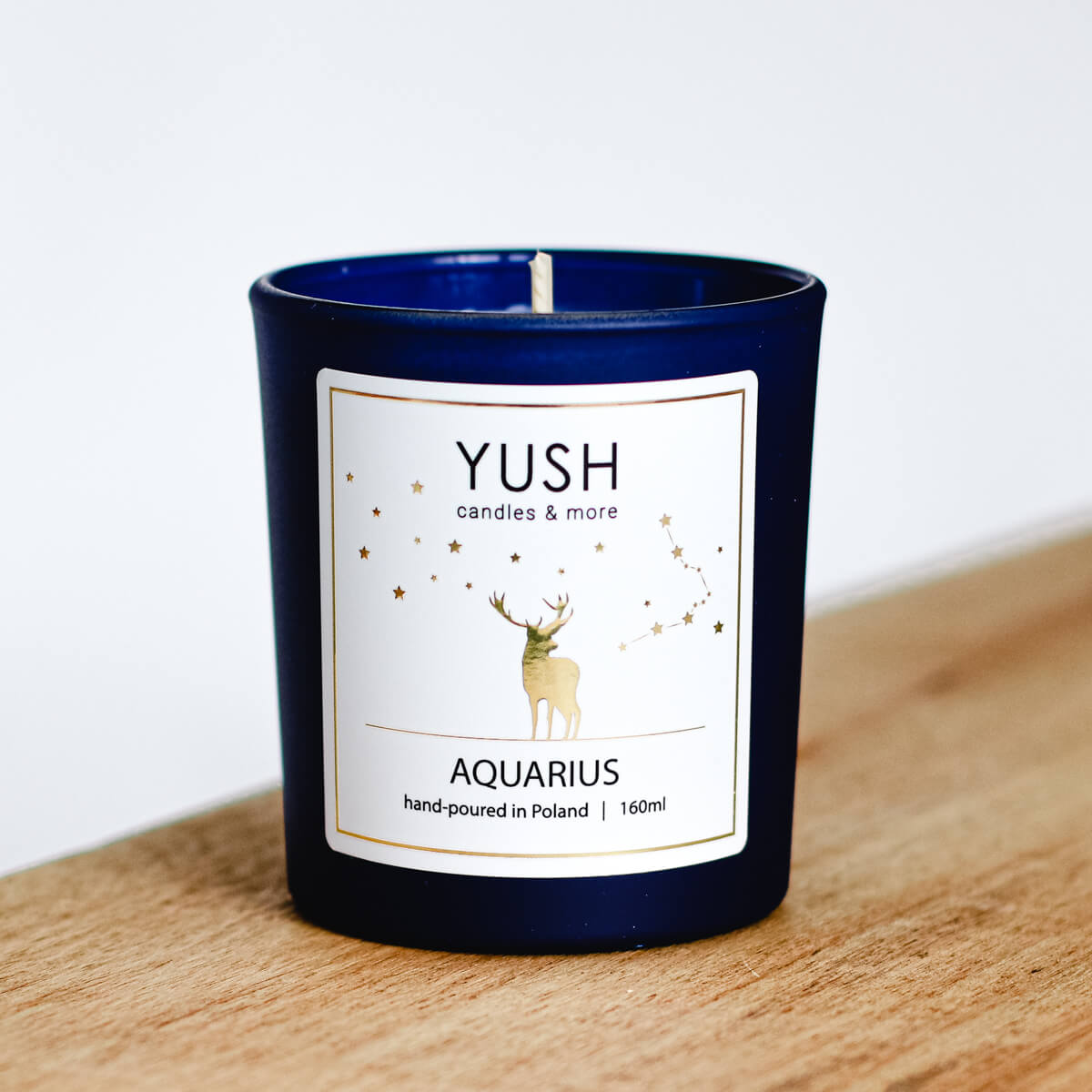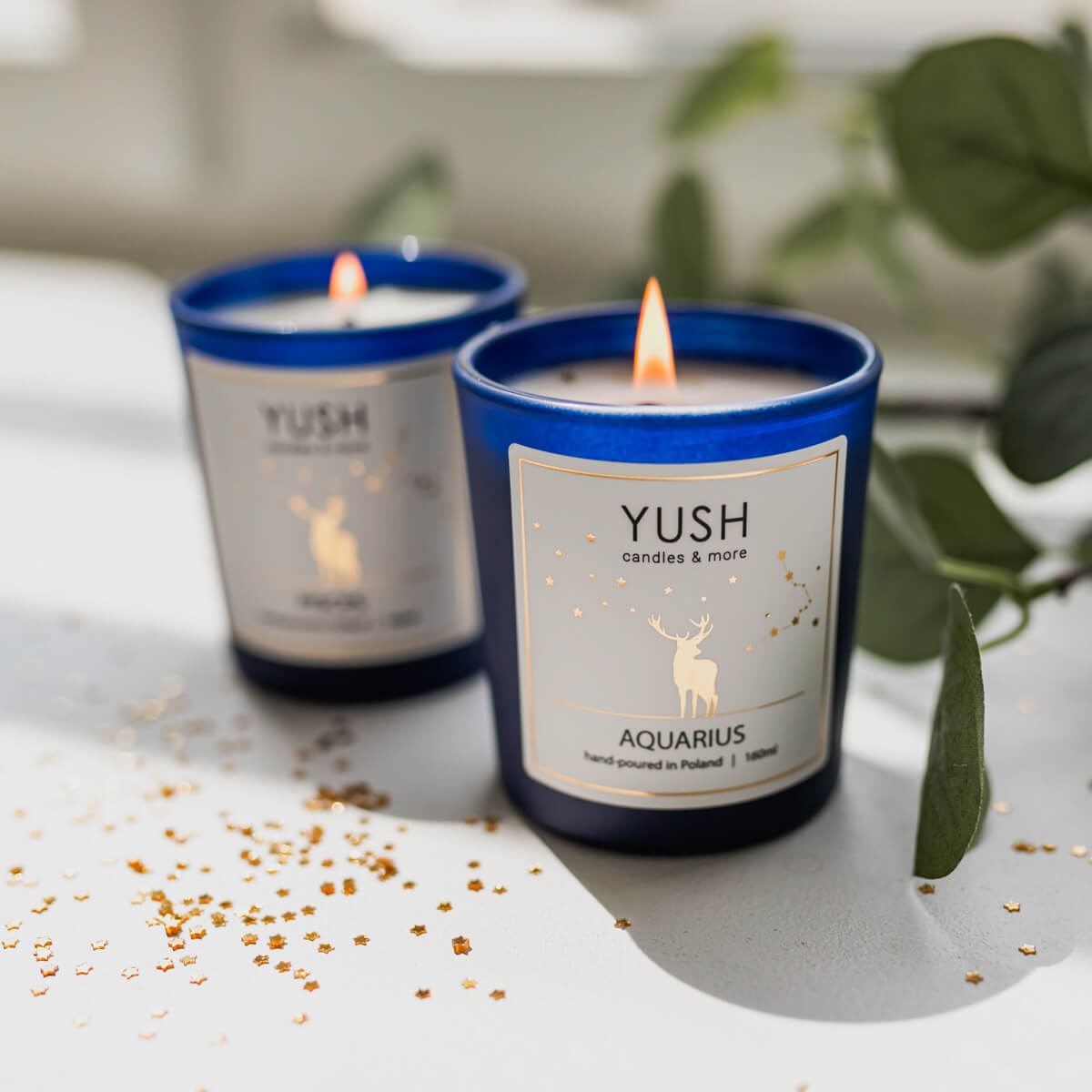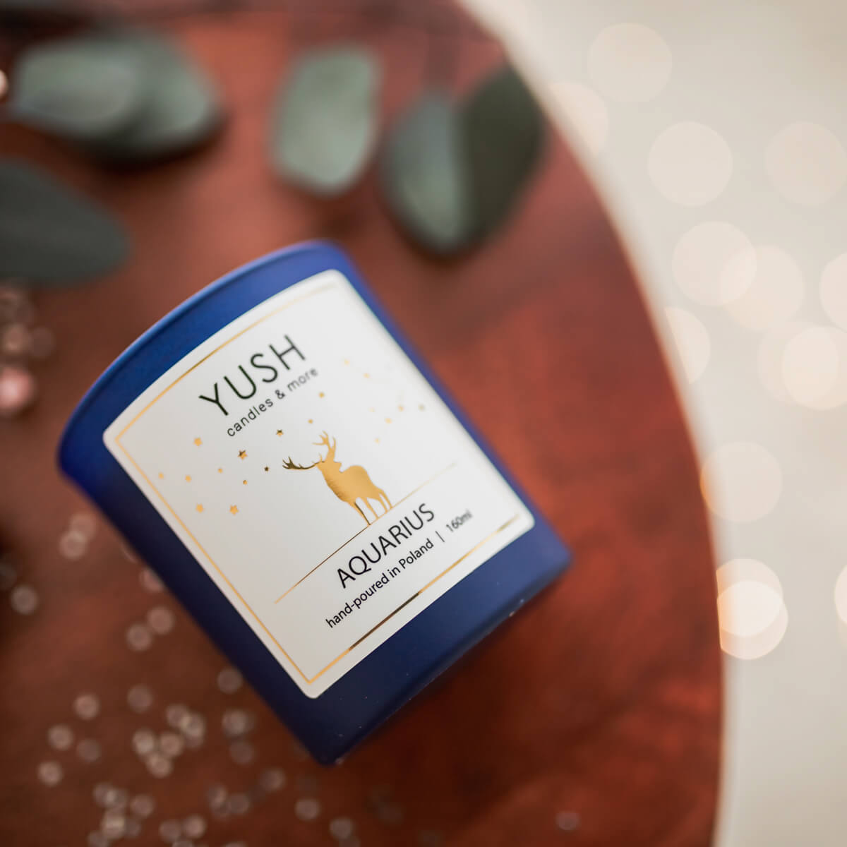 Każda świeca sojowa zamknięta jest w szklanej szklance, z elegancją, satynową etykietą ze złoceniem oraz ozdobnym, granatowym pudełkiem ze złoconymi konstelacjami wokół, według mojego autorskiego projektu.