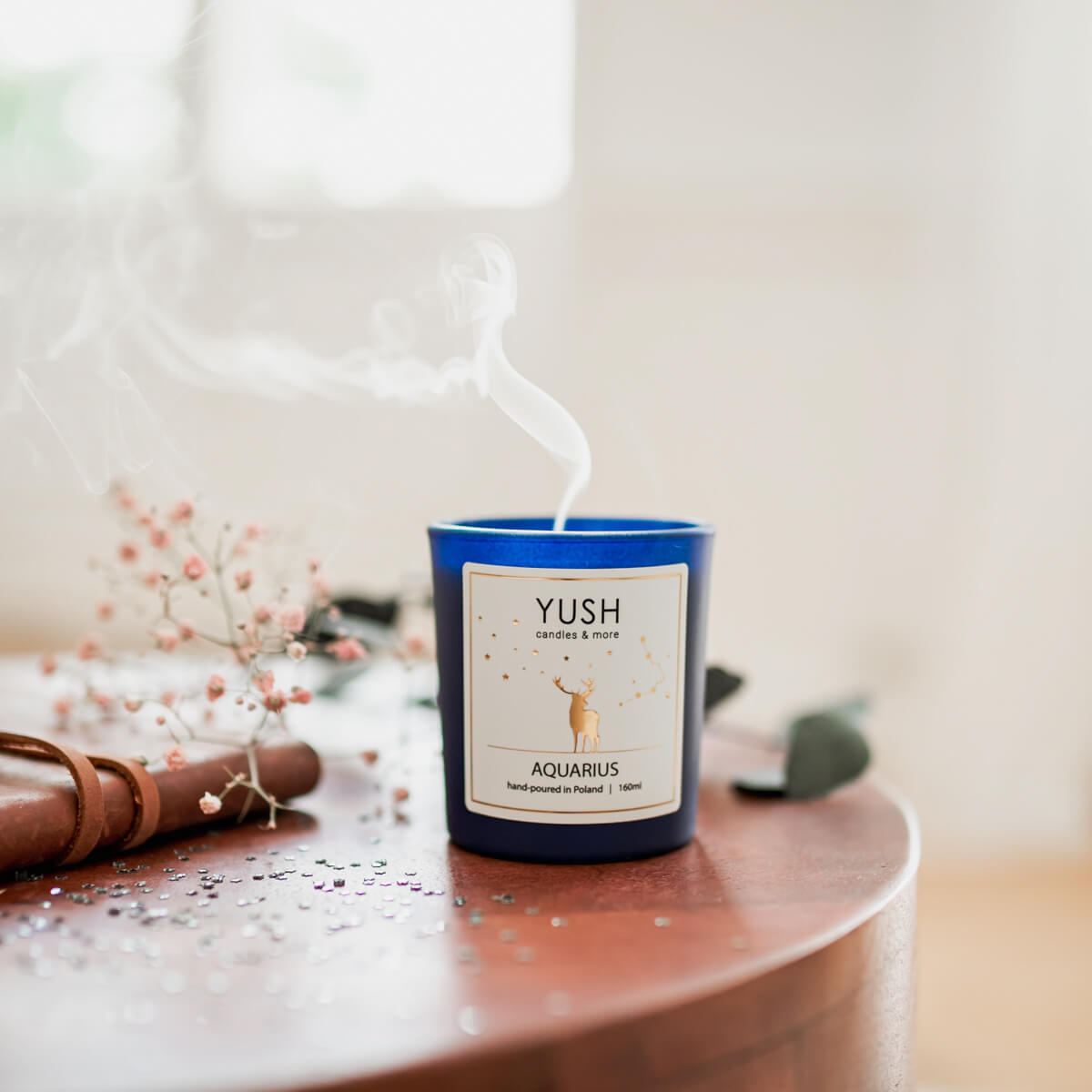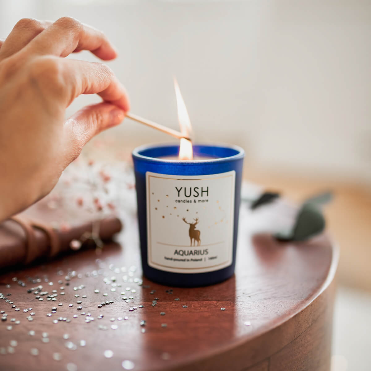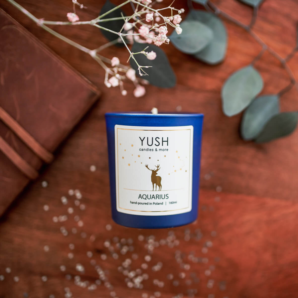 Każda świeca sojowa zamknięta jest w szklanej szklance, z elegancją, satynową etykietą ze złoceniem oraz ozdobnym, granatowym pudełkiem ze złoconymi konstelacjami wokół, według mojego autorskiego projektu.