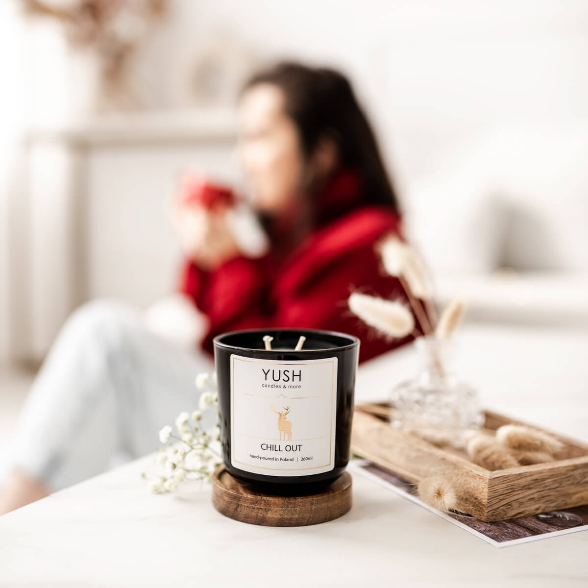 Każda szklanka pakowana jest w czarny kartonik z logo YUSH; świeca jest zabezpieczona nakładką papierową, która chroni przed kurzem i zabrudzeniami (należy ją zdjąć przed zapaleniem, można ponownie nałożyć po całkowitym zastygnięciu wosku); do świecy można dokupić drewniane wieczko, które będzie uniwersalne na każdą świecę z kolekcji; po wypaleniu świecy i usunięciu knota szklanki w myśl zasady #zerowaste stworzą cudowny komplet w Twojej kuchni;