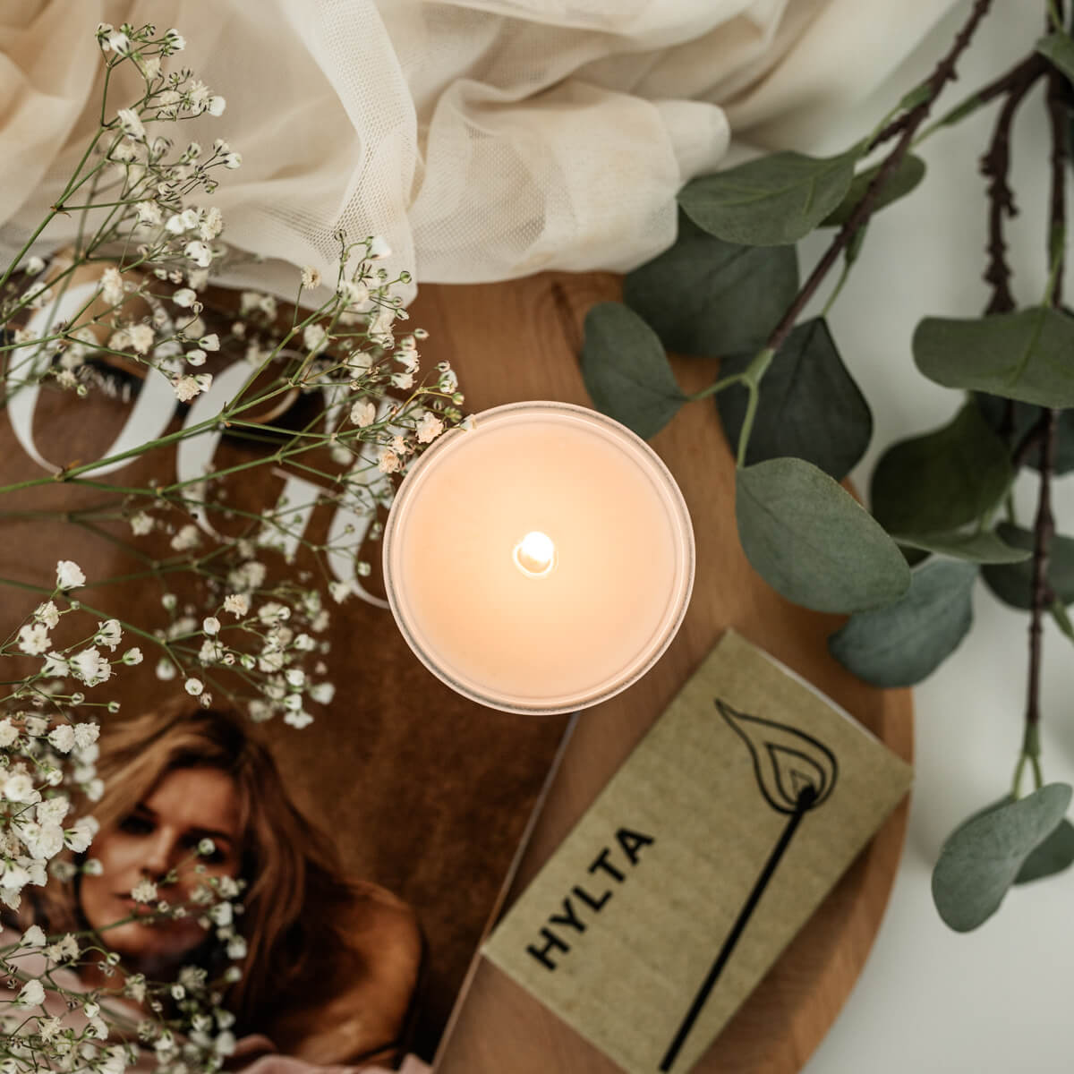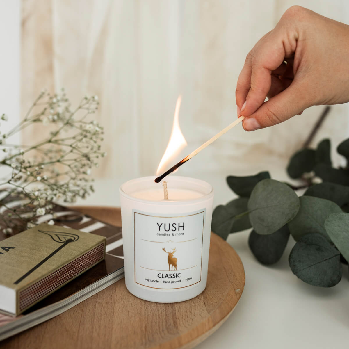 Każda świeca sojowa zamknięta jest w szklanej szklance, z elegancją, satynową etykietą ze złoceniem oraz ozdobnym, białym, minimalistycznym pudełkiem.