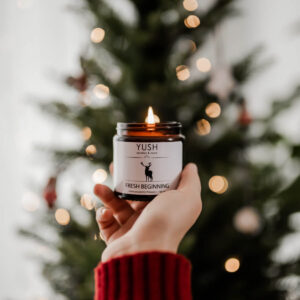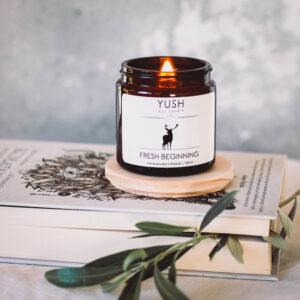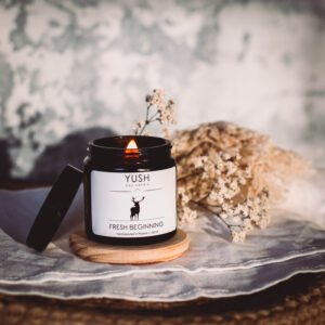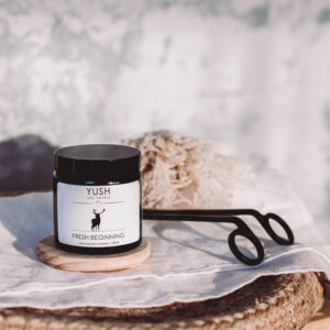 Świeca sojowa Fresh beginning to 120ml wosku sojowego z najcudowniejszymi aromatami: wiosennymi kwiatami, naturalną paczulą i podniosłym białym cedrem. Część z naszych klientów we Fresh beginning odnajduje także naturalne aromaty liściaste i mchu. Każda świeca sojowa zamknięta jest w szklanym słoiczku z czarną zakrętką. Każdą świecę możesz zapakować w czarny woreczek zgodnie z filozofią No Waste – dodaj do koszyka – kup woreczek YUSH »