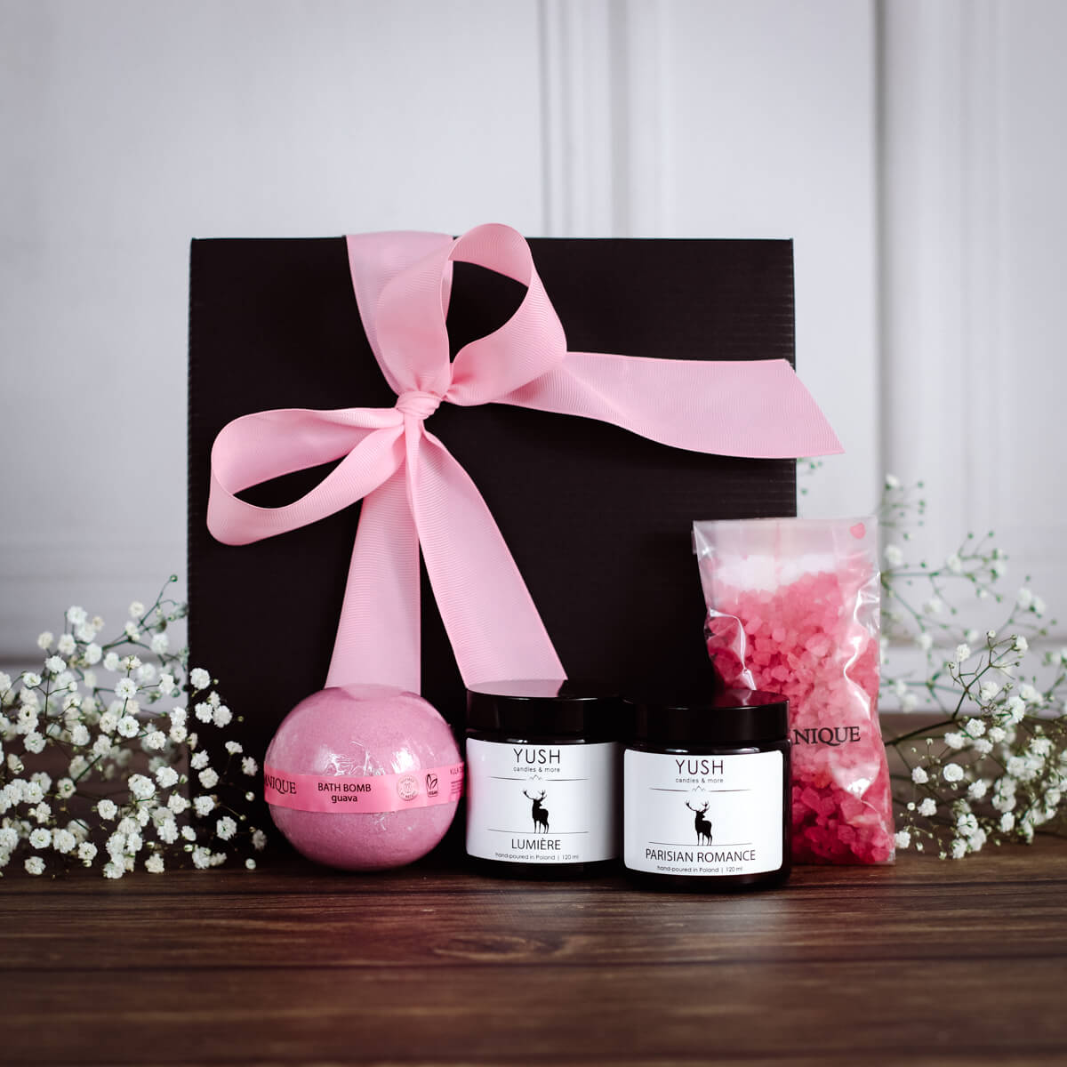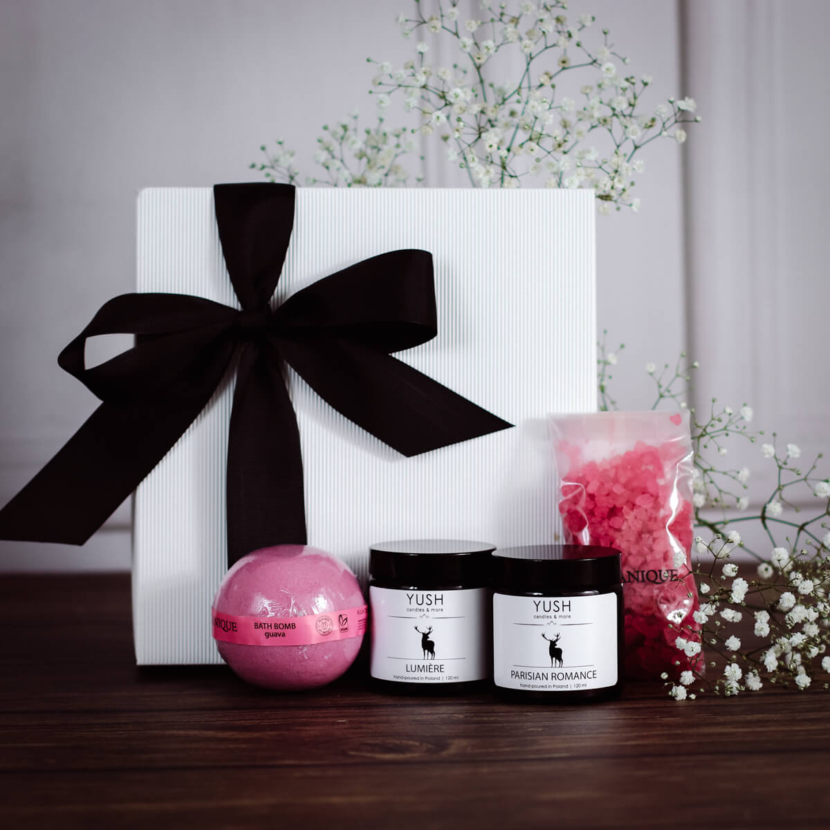 Idealny komplet zapakowany w śliczne, tekturowe pudełko z pokrywką, z białym wypełniaczem w środku, obwiązane piękną, grubą wstążką. Kolor kartonika do wyboru: biały lub czarny.