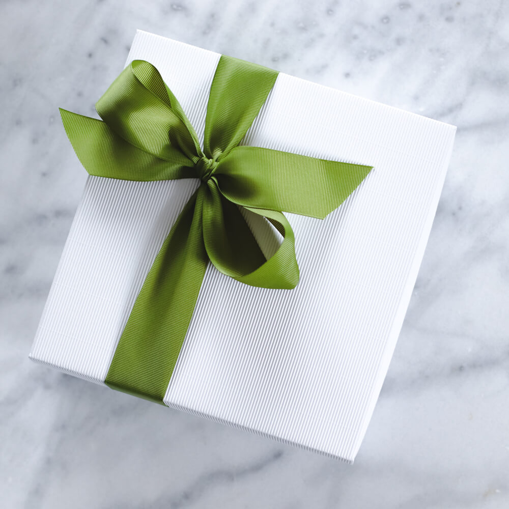 Idealny komplet zapakowany w śliczne, białe, tekturowe pudełko z pokrywką, z białym wypełniaczem w środku, obwiązane piękną, grubą, zieloną wstążką.