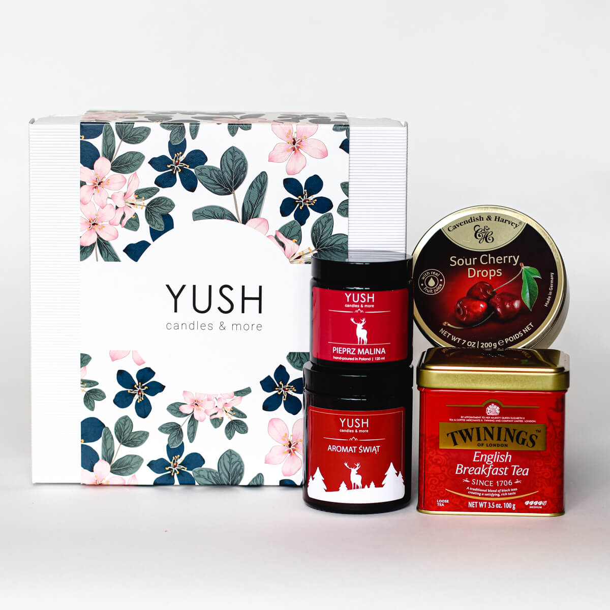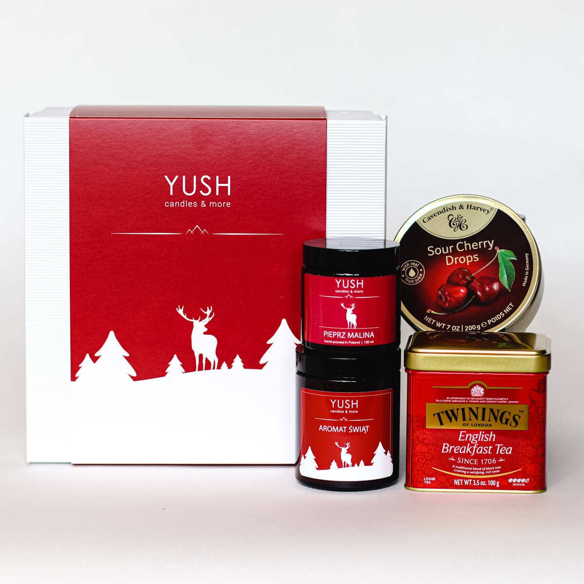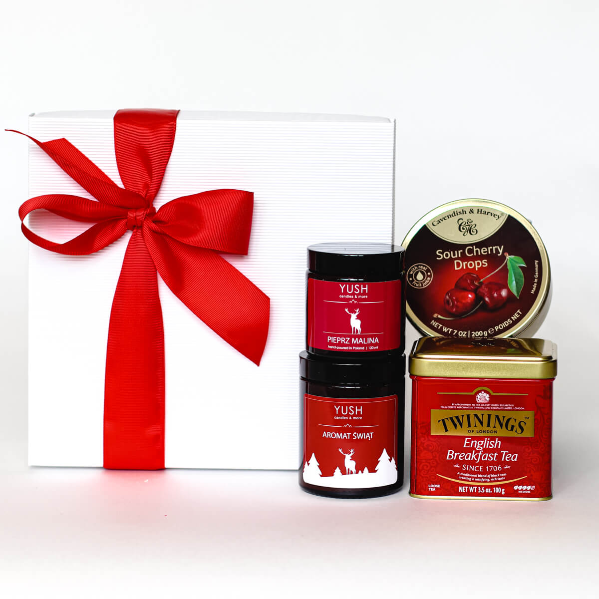 Świąteczny zestaw prezentowy z dwoma wyjątkowymi świecami zapachowymi. Barwą dominującą w tej kompozycji jest świąteczna czerwień. W tym zestawie znajdziesz aromatyczne świece sojowe: Aromat Świąt 180m i Pieprz Malina 120ml. Całość dopełniają pyszne, wiśniowe dropsy oraz aromatyczna, czarna herbata.