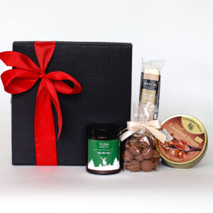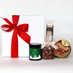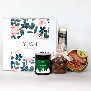 Świąteczny zestaw prezentowy z karmelkami i orzechami. Pyszne słodycze uzupełnia aromatyczna, świąteczna świeca sojowa. Zestaw prezentowy idealny do wręczenia bliskiej osobie.