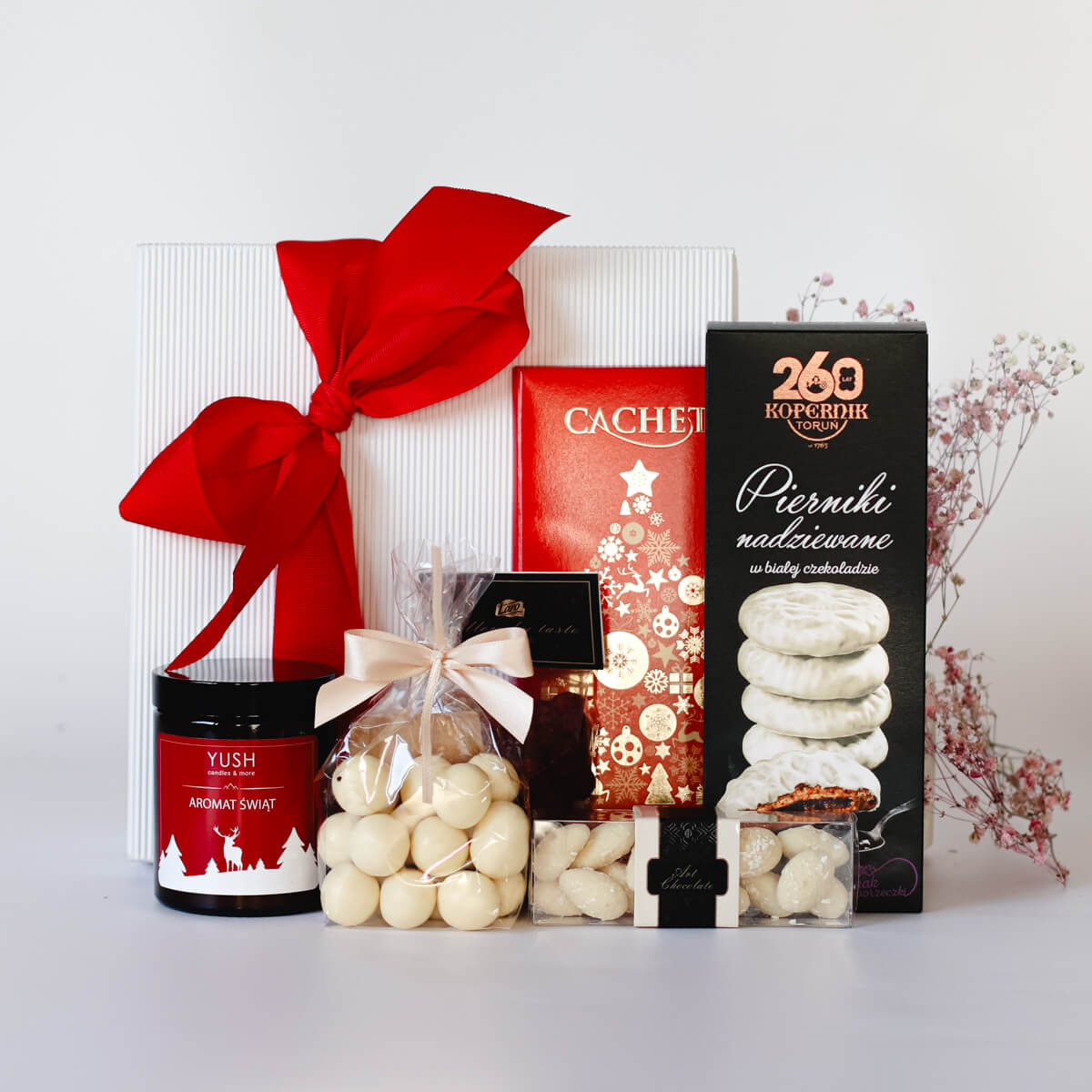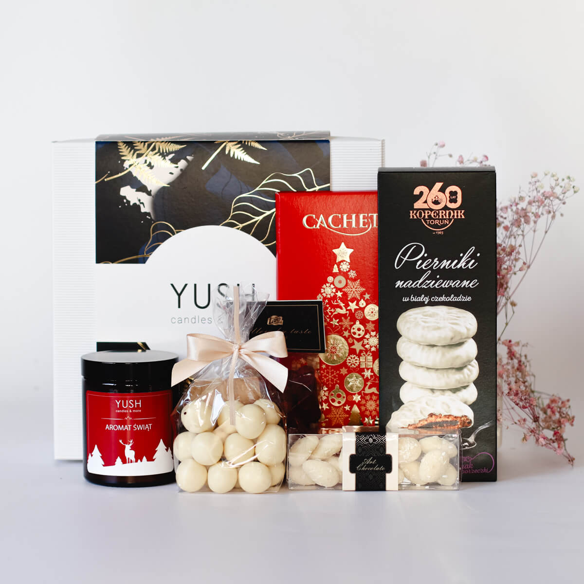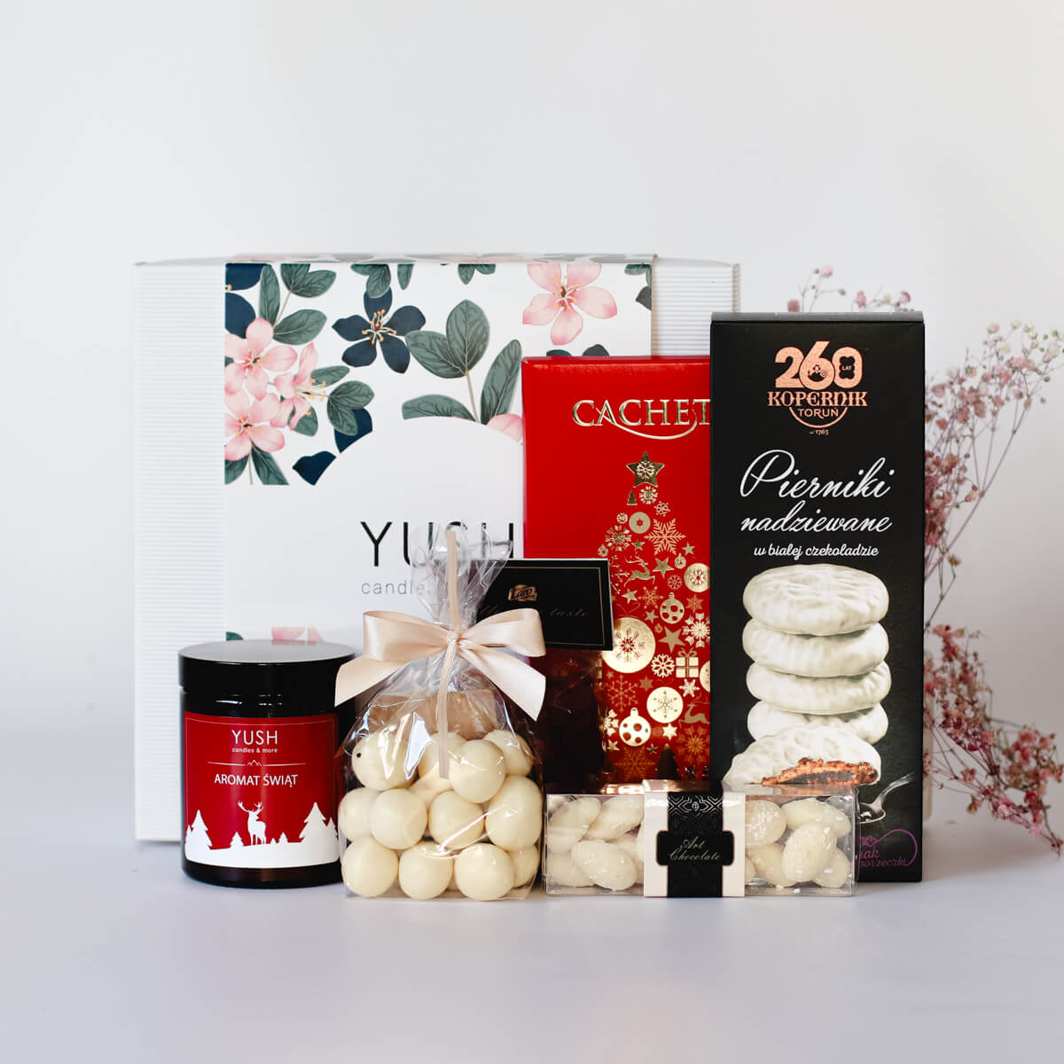 Ten zestaw to idealny prezent dla każdego miłośnika świec i zapachów! Pod choinką będzie się przepięknie komponował. Elegancki komplet z cudownie pachnącą świecą oraz słodkimi dodatkami.