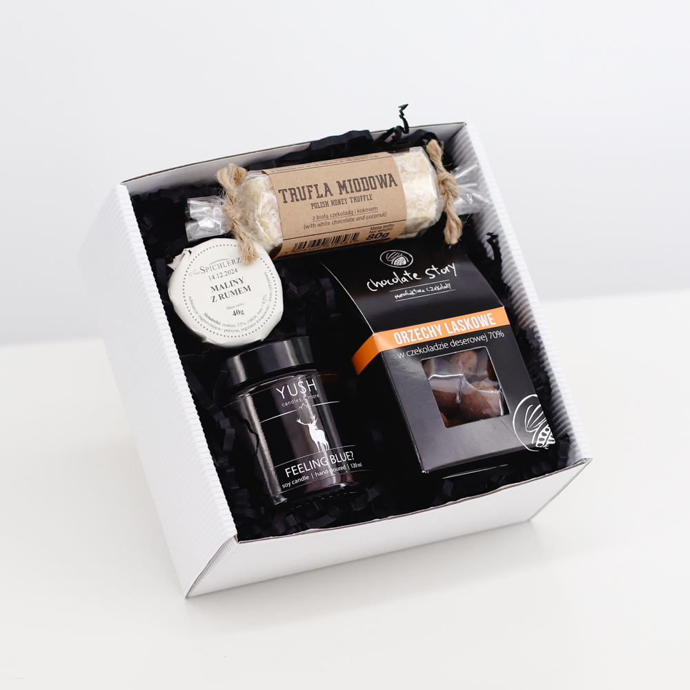 Elegancki zestaw prezentowy z serii Drobne Okazje z cudownie pachnącą świecą sojową i wyśmienitymi dodatkami, zapakowany w biały kartonik z ozdobną wstążką.